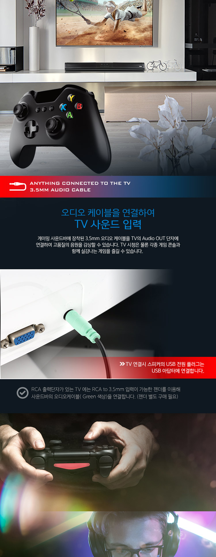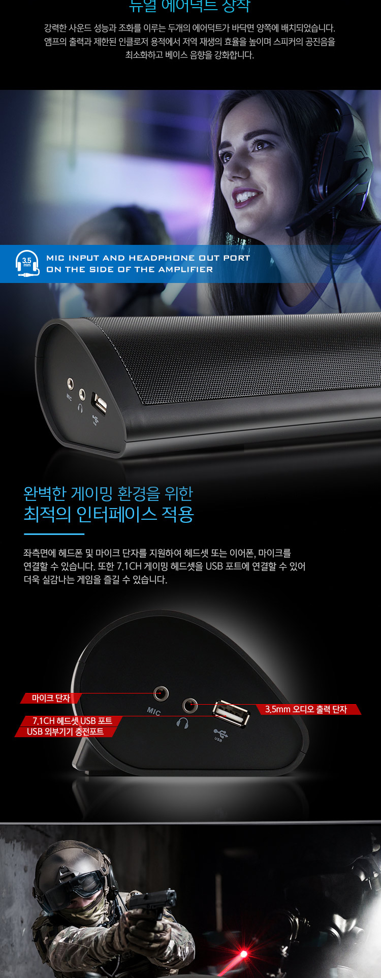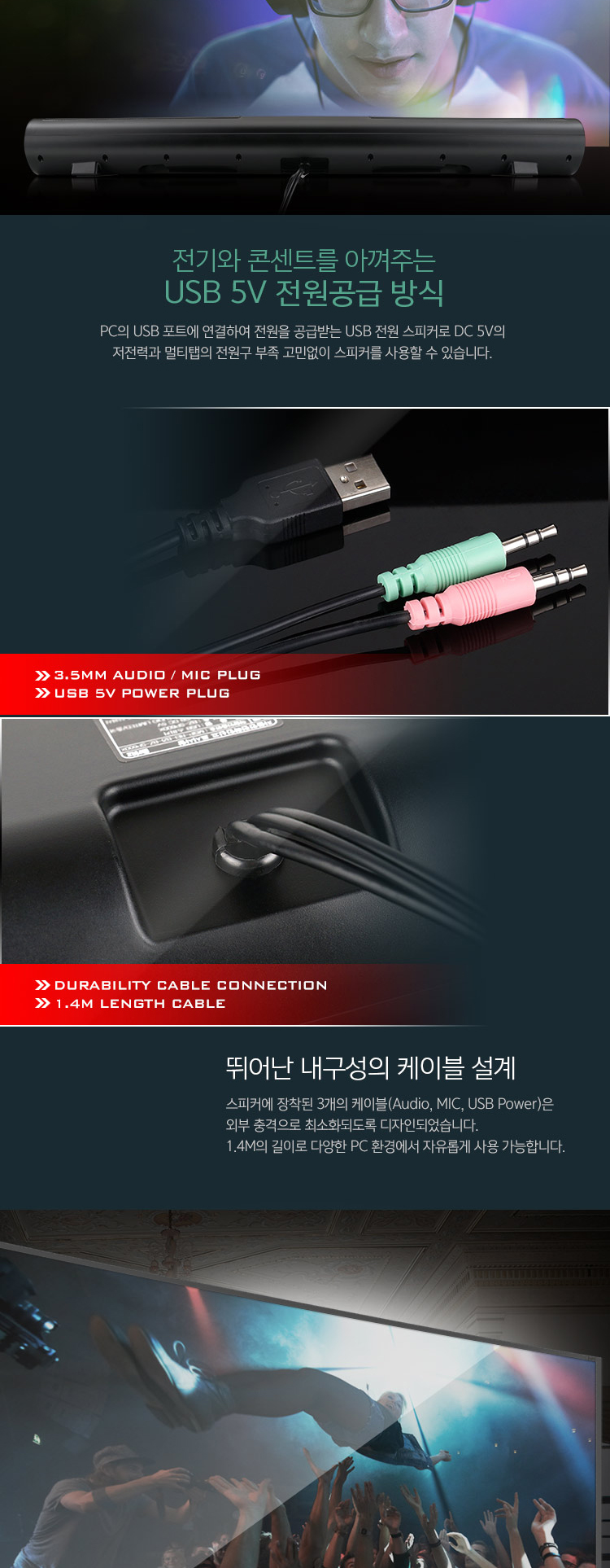 PC 스피커 / 2채널 / USB 전원 / BAR형 / 일반형 / 3.5mm / 10(5Wx2)W / 4Ω / 헤드폰 단자 / 마이크 단자