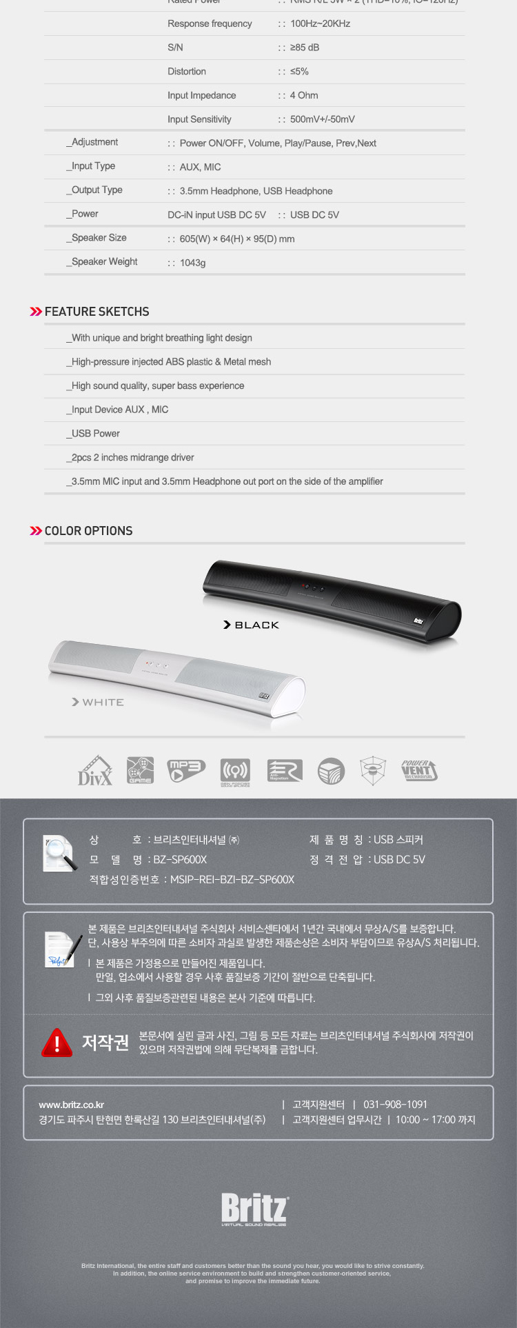 외부기기충전 / USB전원 / 무게: 1.04kg / 사운드바가로: 605mm