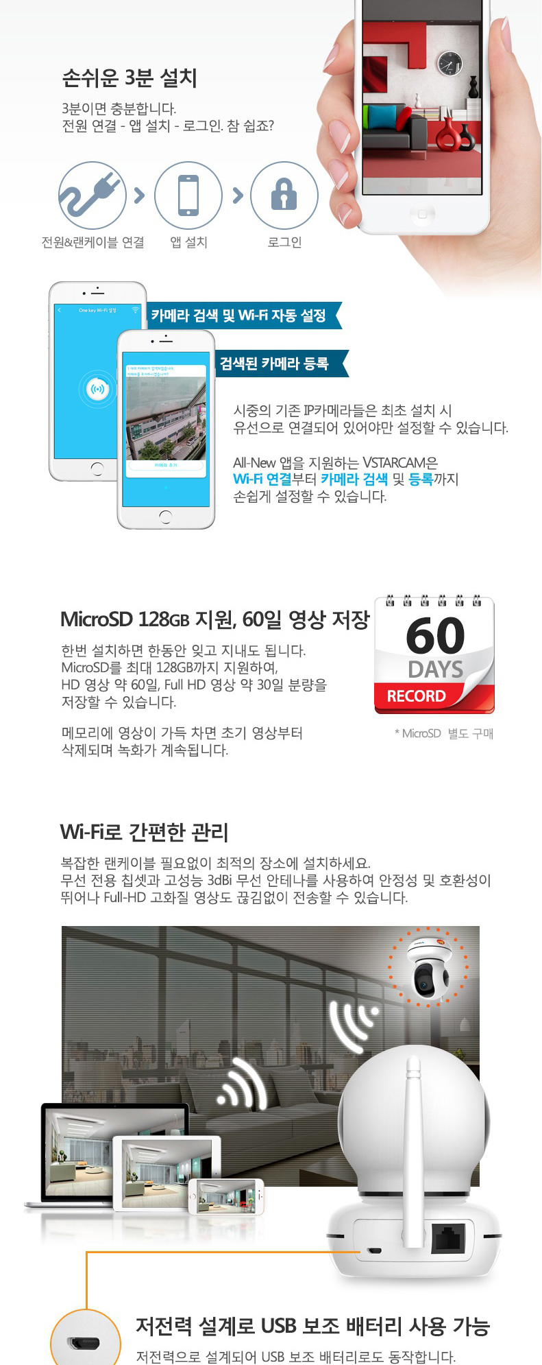 - IP 카메라 / 스탠드형 / IP / 실내용 / CMOS / 200만화소 / 풀HD화질(1080p급) / 최저 조도: 0.5 lx / 광학단렌즈 / 4mm / 팬(좌우): 350˚ / 틸트(상하): 90˚ / 스마트폰지원 / 양방향통화 / 원격각도조정 / 동작감지 / 적외선LED / MicroSD 카드 / 야간가시거리: 10m / 무선랜(WiFi) / 5.5W / USB 보조배터리 동작 지원 / 103˚ 와이드뷰 / 크기: 74 x 85 x 111mm / 무게: 210g