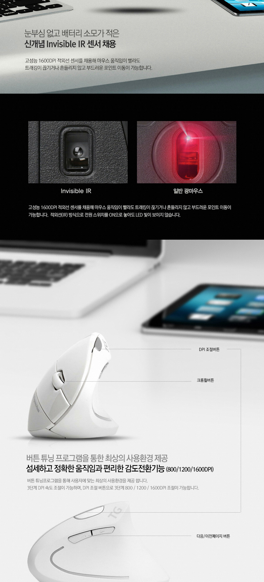 마우스 / 적외선 / DPI+5버튼 / 무선 / USB / 상하 / 1600DPI / 소프트웨어 지원 / 손목터널증후군 방지 /