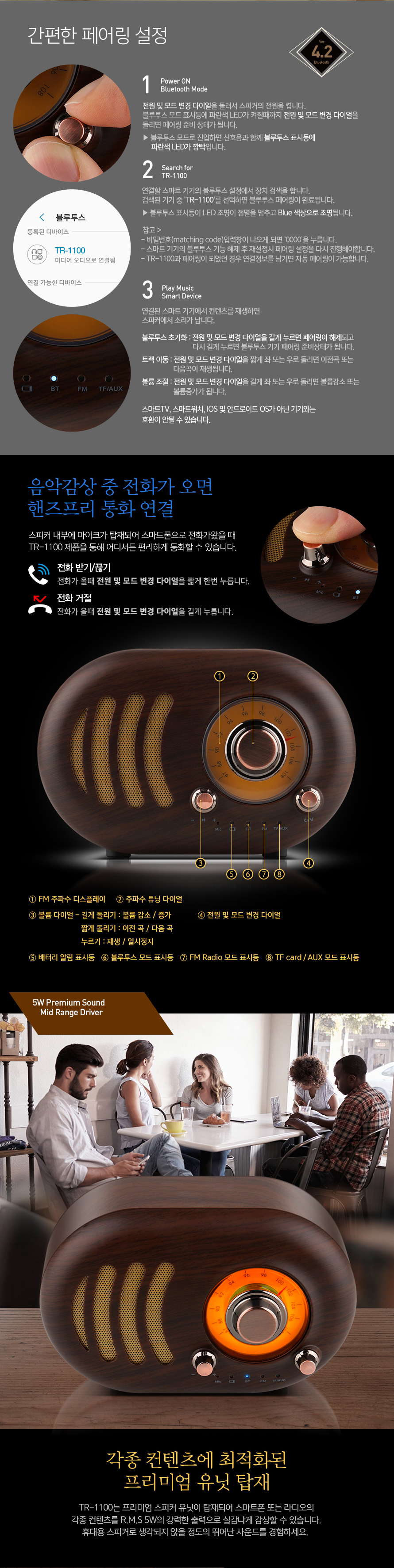 포터블스피커/5W/100Hz~18KHz/ver 4.2/A2DP/AVRCP/HSP/HFP/블루투스/AUX단자/micro SD/라디오/전화통화
