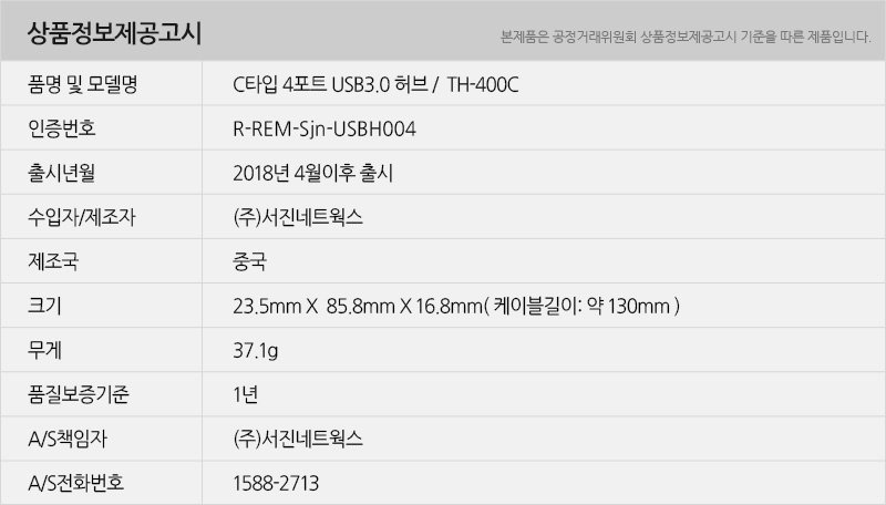 > TH-400C USB3.1 Gen1 C-TYPE 4포트 USB허브 무전원