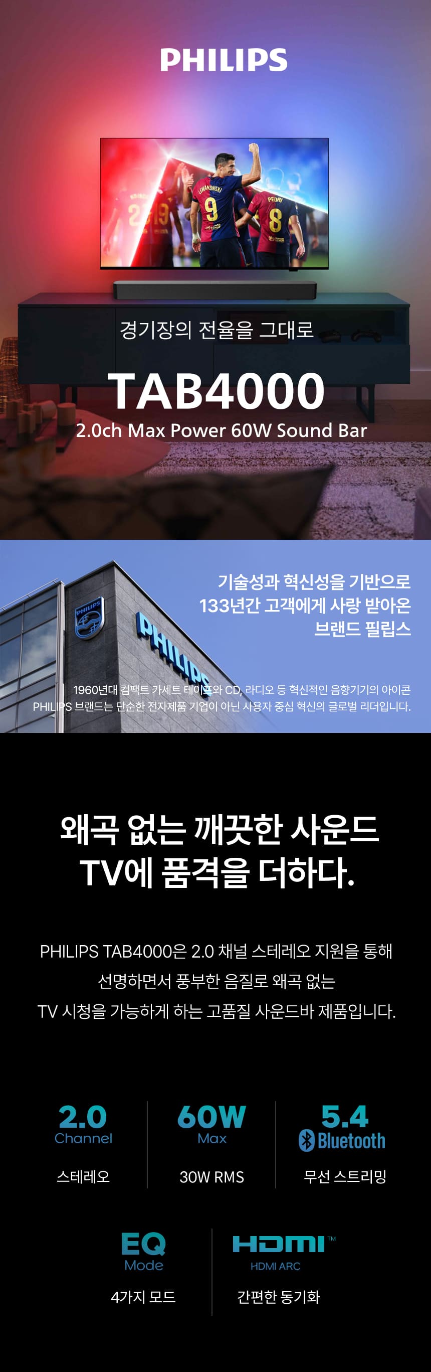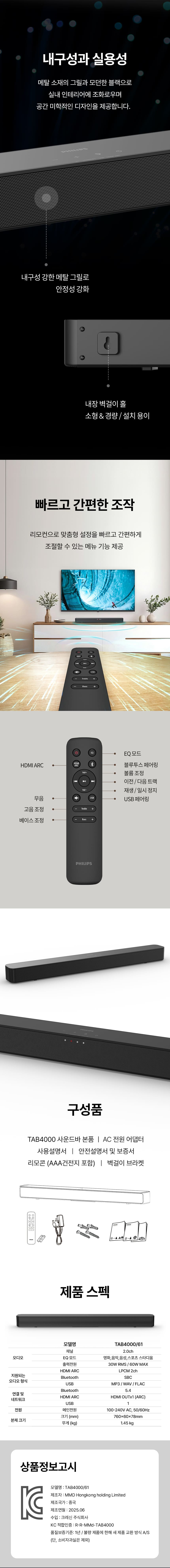 > 필립스 TAB4000 60W 유무선겸용 블루투스 사운드바
